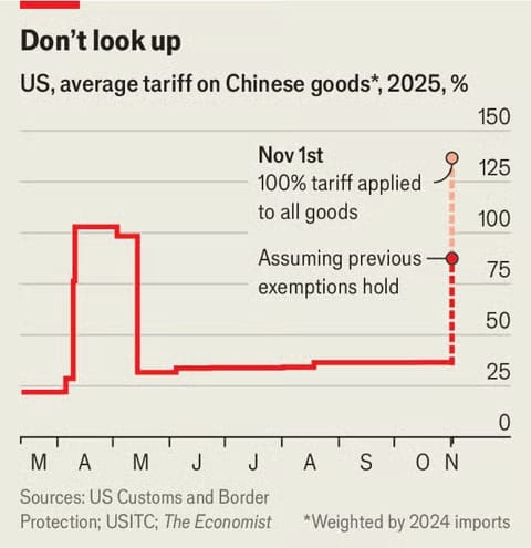 Amerikan borsasının coşkulu hali de Trump’a güven vermemeli. Piyasalar nisan ayından bu yana kısmen Trump’ın en sert tehditlerini geri çekmesi nedeniyle yükseldi. Hisseler 10 Ekim’de düşüş yaşadıktan sonra toparlandı çünkü yatırımcılar Trump’ın yine geri adım atacağını düşünüyor. Ancak Trump gerçekten %100 tarife uygularsa işler tamamen değişir. Yatırımcılar Trump’ın kendilerinden korkmadığı sonucuna varırsa bu kez onlar ondan korkacaktır.