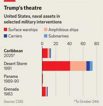 26 Ekim’de, bir Amerikan destroyeri Trinidad ve Tobago’ya (Venezuela’ya yalnızca 11 km uzaklıkta bir ada ülkesi) demirledi. Resmî açıklamaya göre bu, ABD Deniz Piyadeleri’nin katıldığı bir eğitim tatbikatının parçasıydı. Ancak bu hareket, donanma unsurlarını kıyıya daha yakın konumlandırmak için de örtülü bir adım olabilir. Pentagon’un başındaki Pete Hegseth, ayrıca yeni bir Uyuşturucuyla Mücadele Görev Gücü kurulduğunu açıkladı. Bu birim, deniz piyadelerinin üç sefer gücünden biri tarafından yönetilecek.