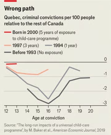 Üç yaş civarındaki okul öncesinden bebeklik dönemine kadar programları genişletmenin ciddi bir sorunu var. Çocukların erken gelişimi, akranlarıyla birlikte vakit geçirmekten çok yetişkinlerle kurulan yoğun etkileşime bağlı görünüyor. Bu nedenle, merkez temelli bakımın itibarlı olduğu ve maliyetin %85’ine kadarının devlet tarafından sübvanse edildiği Fransa gibi ülkelerde bile, Wisconsin-Madison Üniversitesi’nden Lawrence Berger ile Fransa Ulusal Demografi Enstitüsü’nden Lidia Panico ve Anne Solaz’ın araştırmaları Quebec’tekine benzer sonuçlar buldu. Bir yaşında kreşe giden çocukların, iki yaşına geldiklerinde davranışlarının, evde ebeveynleriyle veya bakıcıyla büyüyenlere kıyasla çok daha olumsuz olduğu bildirildi.