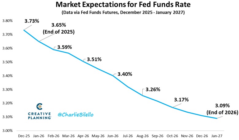 Charlie Bilello’nun Creative Planning için hazırladığı eğriye göre, Aralık 2025’te efektif faiz %3,73’ten %3,65’e, ardından 2026 boyunca adım adım %3,09 seviyesine geriliyor. Yani masada ani bir “sıfıra koşan Fed” değil, enflasyonu tamamen bırakmadan, büyümeyi de öldürmeden aşağı inen bir patika var.
