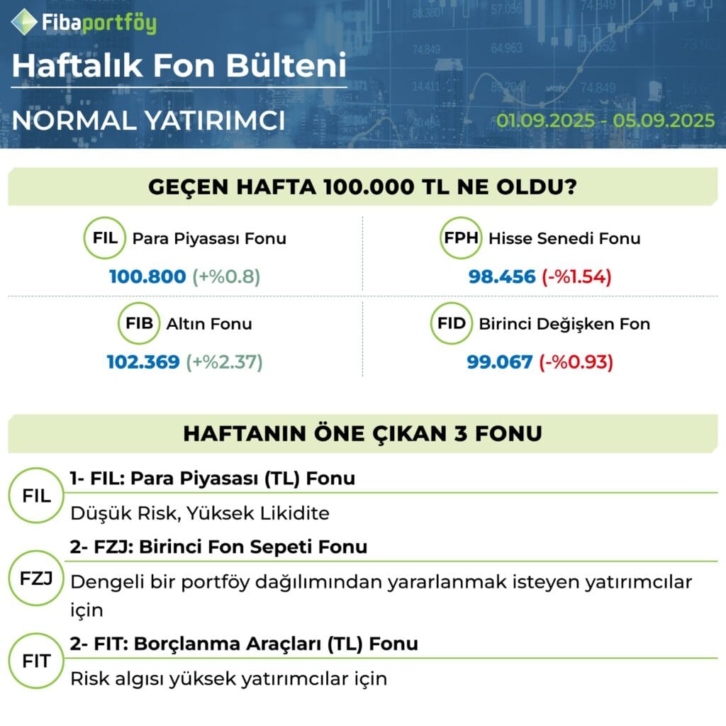 Geçtiğimiz hafta fon piyasalarında normal yatırımcı profili için dalgalı bir tablo öne çıktı. 100.000 TL’lik başlangıç yatırımı, özellikle altın fonunun güçlü performansıyla değer kazanırken, hisse senedi ve değişken fonlarda kayıplar dikkat çekti. Altın Fonu %2,37’lik artışla haftanın en yüksek getirisi olurken, Hisse Senedi Fonu %1,54 değer kaybetti. Daha temkinli yatırımcılar içinse Para Piyasası Fonu %0,8’lik getirisiyle güvenli liman işlevi gördü.