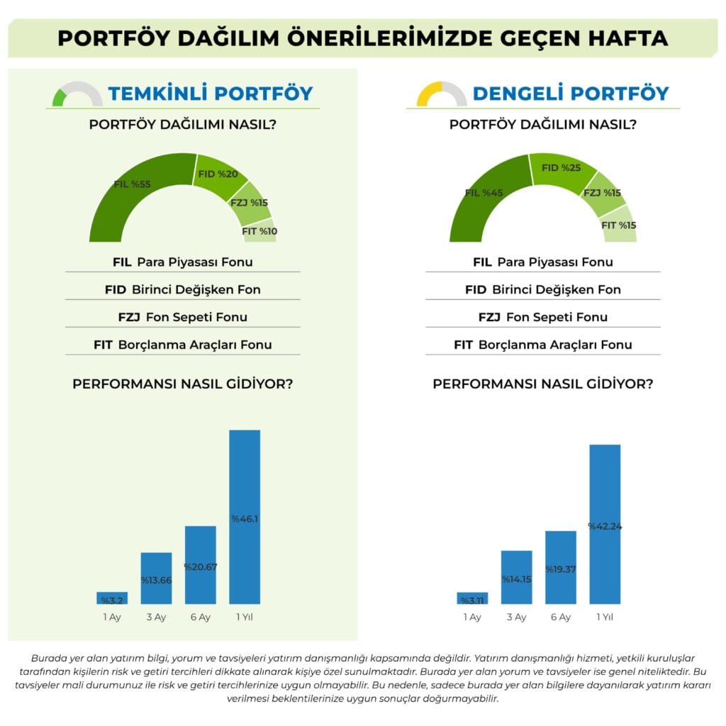 Yeni haftada öne çıkan üç fon arasında düşük riskli ve likiditesi yüksek Para Piyasası Fonu, dengeli dağılım imkânı sunan Fon Sepeti Fonu ve daha yüksek risk iştahına hitap eden Borçlanma Araçları Fonu bulunuyor. Bu dağılım, yatırımcılara hem güvenli hem de fırsat odaklı stratejiler arasında tercih yapma imkânı sunuyor.