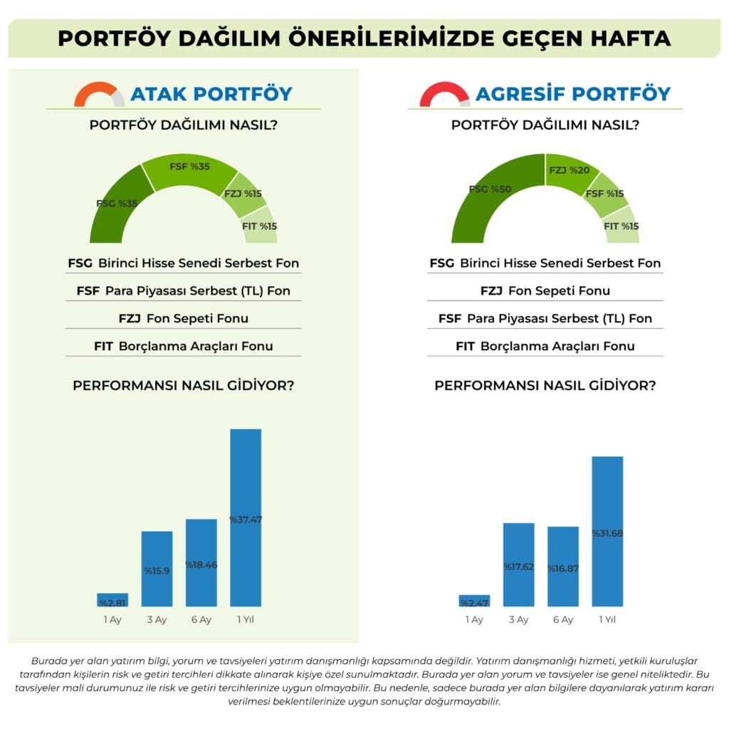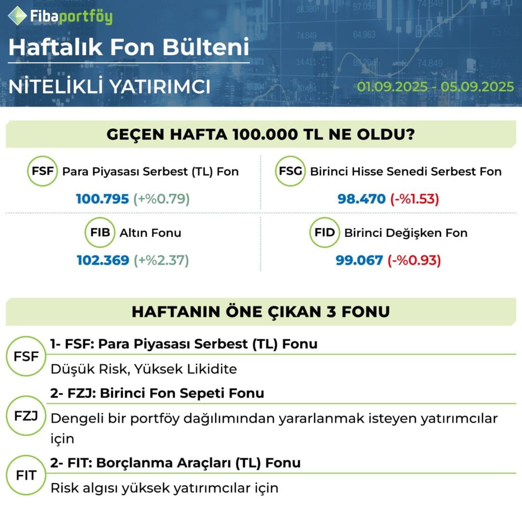 Geçtiğimiz hafta fon piyasaları yatırımcılara hem fırsatlar hem de uyarılar sundu. 100.000 TL’lik başlangıç portföyü, farklı fon türlerine göre ayrışan getiriler sergiledi. Para piyasası ve altın fonları pozitif performansıyla öne çıkarken, hisse senedi ve değişken fonlar negatif tarafta kaldı. Özellikle Altın Fonu %2,37 artışla haftanın kazananı olurken, hisse tarafında görülen düşüş yatırımcıların risk iştahındaki dalgalanmayı yansıttı.