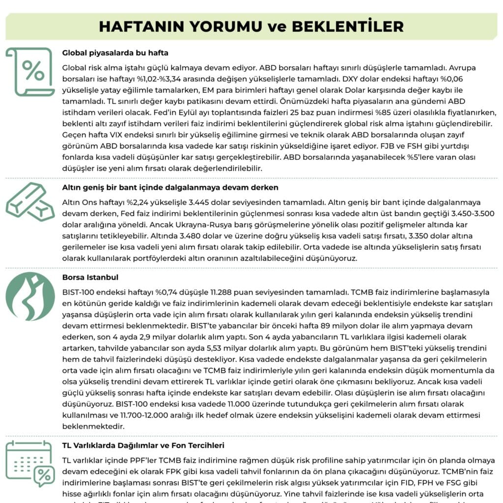 Yeni haftaya girerken düşük riskli ve yüksek likidite sunan Para Piyasası Serbest Fonları, dengeli dağılım arayışındaki yatırımcılar için Fon Sepeti Fonları ve daha agresif getiri peşinde olanlar için Borçlanma Araçları Fonları ön plana çıkıyor. Piyasalarda belirsizliğin sürdüğü bu dönemde, yatırımcıların portföylerinde denge ve risk yönetimini gözetmeleri kritik önem taşıyor.