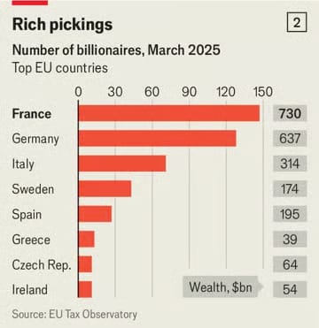 Fransa’nın vergi ve sosyal yardım sistemi eşitsizliği düzeltme konusunda kapsamlı bir işlev görüyor. Toplam vergi yükü GSYİH’nin %46’sına denk geliyor ki bu, AB içindeki en yüksek oran. Ancak Fransa’daki süper zenginlerin serveti hızla artarken, Zucman’a göre en üstteki %0,01’lik kesim, vergi optimizasyon araçları sayesinde herkesten daha düşük oranda vergi ödüyor. Fransa’daki ortalama fiili vergi oranı %50 iken, ülkede AB’nin en fazla milyarderine sahip olmasına rağmen bu milyarderlerin gelirlerinin sadece %27’si vergiye gidiyor.