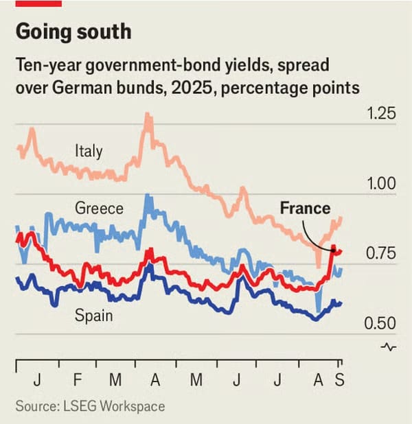 Fransız siyasetçiler tahvil piyasasını ne kadar zorlayabilir? GSYİH’nin %5,4’üne ulaşan, Amerikan tarzı bütçe açığını azaltma çabaları, yakında bir hükümeti daha düşürebilir. 8 Eylül’de Başbakan François Bayrou, önerdiği harcama kesintileri nedeniyle güven oylamasıyla karşı karşıya kalacak. Kaybetmesi neredeyse kesin görünüyor. Bu durum yeni bir azınlık hükümetiyle sonuçlanırsa, borçlanmayı anlamlı biçimde azaltacak bir bütçe geçirmek için yeterli oy bulma ihtimali düşük. Bu arada, on yıllık Fransız devlet tahvillerinin getirisi %3,6’ya yükseldi; bu oran Yunanistan’ın on yıllık getirisinin üzerinde ve kıtanın alışıldık mali zorluklar içindeki ülkesi İtalya ile aynı seviyede (bkz. grafik).