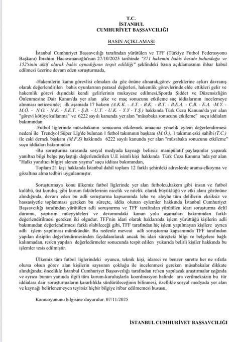 • Soruşturma, hakemlerin bahis hesaplarıyla ilişkili olduğu ve müsabaka sonuçlarını etkileme şüphesi taşıdığı iddialarını da içeriyor.