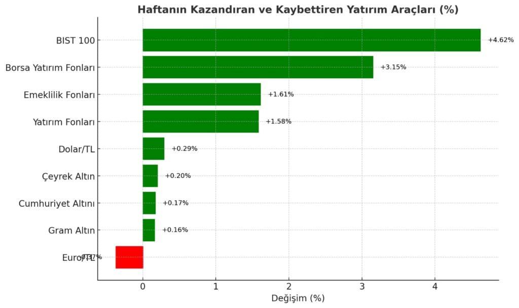 🎯 Özetle: Euro elde yaktı, altın yerinde saydı, borsa ve fonlar yatırımcısına güldü. BIST 100 ise haftanın açık ara kazananı oldu.