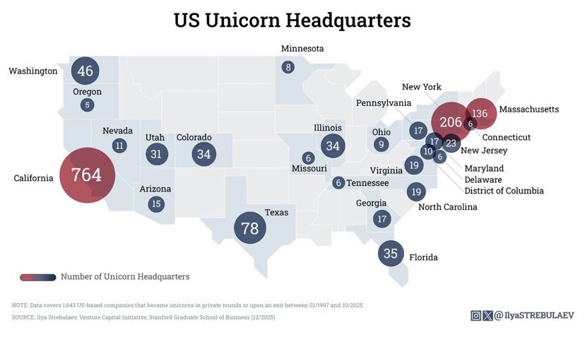 Bu üstünlük artık sadece California’nın tekelinde değil. Haritadaki dağılım, silisyum vadisinin ülke geneline yayıldığını gösteriyor: Texas (78 unicorn), Florida (35), New York (206), Massachusetts (136), Washington (46), Colorado (34)… Her biri kendi mikro ekosistemini kurmuş durumda. Sonuç, tek merkezli bir inovasyon vadisinden çok merkezli, esnek ve ölçeklenebilir bir inovasyon ağına dönüşüm.