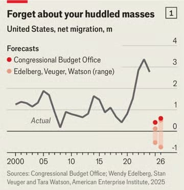 Donald Trump gümrük tarifelerini 1930’lar seviyesine yükseltmiş ve Fed’e savaş açmış olabilir; fakat “Sıfır Göç Amerikası” onun tüm ekonomik politikaları arasında en önemlisi olma potansiyeline sahip. Yenilikçilerin ve işçilerin ülkeye girişini engellemek, yalnızca Amerika’nın başarısının temel direklerinden birini hedef almakla kalmıyor—aynı zamanda yerli doğumlu işgücünün hızla yaşlandığı bir dönemde gerçekleşiyor.