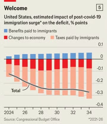 Amerika sınırlarını talihsiz bir zamanda kapatıyor (bkz. grafik 4). Yeni gelenler olmadan, ülkenin yerli doğumlu çalışma çağındaki nüfusu azalacaktı. Kamu harcamaları, büyük ölçüde yaşlanan nüfusun talepleri nedeniyle, vergi gelirlerinin oldukça önünde seyrediyor. Amerika’nın bütçe denetçisi olan Kongre Bütçe Ofisi’ne (CBO) göre, Biden dönemindeki göç dalgası önümüzdeki on yılda bütçe açığını yılda 90 milyar dolar (GSYİH’nin %0,2’si) azaltacak. CBO, bu göçmenlerin hem devletin onlara harcadığından daha fazla federal vergi ödeyeceğini, hem de verimliliği artırarak diğer işçilerden alınan vergileri yükselteceğini öngörüyor. Daha düşük göç ise tam tersi etki yaratacak (bkz. grafik 5).