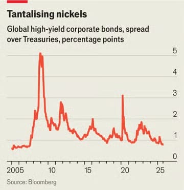 Ve bir kredi patlaması yaşanmasa bile yatırımcılar için başka tehlikeler var. Spreadler tarihsel düşük seviyelerine bu kadar yaklaşmışken, yatırımcıların üstlendikleri risk karşılığında kazanacakları para neredeyse yok. JPMorgan Asset Management’tan Oksana Aronov’un dediği gibi: “Hisse senetlerinde herkes yukarı yönlü potansiyele odaklanıyor. Ama sabit getirili varlıklarda, spreadler tüm zamanların en dar seviyesindeyken, mesele ‘olup olmayacağı’ değil, ‘ne zaman’ olacağıdır. O buhar silindirinin önünde bozuk para toplamaya çalışmak istemezsiniz.”