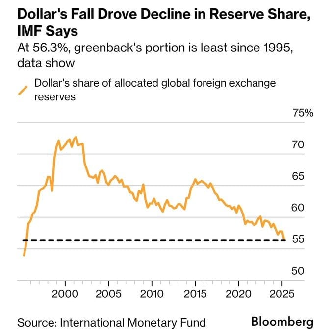 Uluslararası Para Fonu’nun (IMF) güncel verileri, doların küresel döviz rezervlerindeki hakimiyetinin zayıflamaya devam ettiğini gösteriyor. Rezerv yöneticilerinin 149 ülkeden derlenmiş verileri incelendiğinde, dolar payı endekslediğinde yüzde 56,32’ye kadar düşmüş durumda ki bu rakam 1995’ten bu yana görülen en düşük seviye.