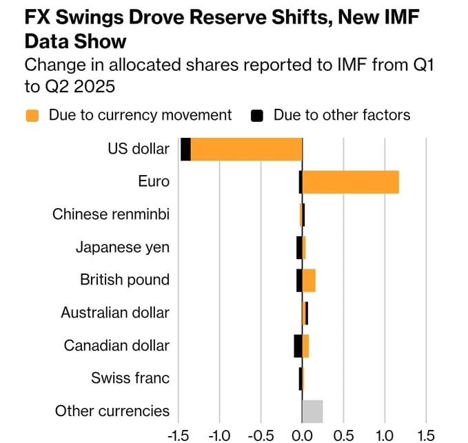 Fakat son dönemde etkin sebep dolar satıp başka paraya geçmeleri değil; kur hareketleri. Doların değerinin özellikle Euro ve altına karşı düşüşü, sabit kalan stoklarda bile yüzdesel payını düşürdü. (2000-2008 arası düşüş sebebi Euro’nun gelmesi. 2020 sonrası: altın payı artışı)