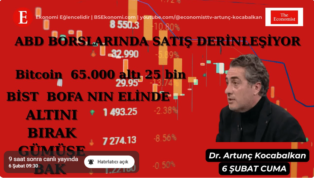 ABD borsalarında satışların derinleştiği, kripto para piyasasının sert sarsıldığı ve emtia dengelerinin değiştiği kritik bir sabah başlıyor. Dr. Artunç Kocabalkan, 6 Şubat Cuma sabahı saat 09:30’da Ekonomist Tv youtube kanalında piyasaların bu kaotik tablosunu verilerle masaya yatırıyor.