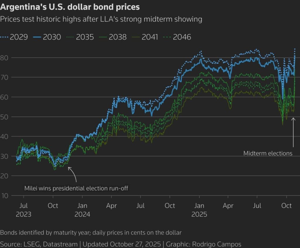 Arjantin piyasaları haftaya güçlü bir açılışla girdi. Devlet Başkanı Javier Milei’nin partisinin pazar günkü ara seçimlerde öngörülenden çok daha büyük farkla kazanmasının ardından ülkenin uluslararası tahvilleri, yerel hisseleri ve pesosu sert yükseldi. Uluslararası tahviller 9 ila 13 sent değerlendi; Buenos Aires Borsası’ndaki hisseler %20’nin üzerinde prim yaptı. Peso dolar karşısında gün içinde %13 artsa da kapanışta %6 yukarıda kaldı.