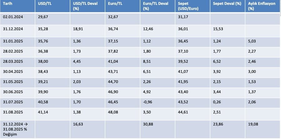 - 2025 başından Ağustos sonuna kadar USD/TL %16,63, Euro/TL %30,88, kur sepeti %23,86 artış kaydetti.