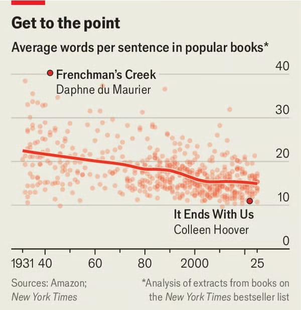 Bununla birlikte, şu anda yaşananların yeni olduğu da söylenebilir. İnsanların daha az okuması bir yana, okunan metinlerin dokusu da değişiyor. Cümleler giderek kısalıyor ve basitleşiyor. New York Times çok satanlarını inceledik ve popüler kitaplarda cümlelerin 1930’lardan bu yana neredeyse üçte bir oranında kısaldığını gördük.