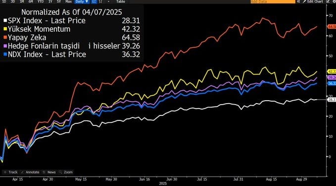Özgür Hatipoğlu’nun sosyal medya paylaşımı, son dönemde piyasalardaki faktör performanslarını yan yana koyarak dikkat çekici bir tabloyu ortaya koydu. Grafiğe göre, yapay zeka temalı hisseler yıl başından bu yana %64,5 ile diğer tüm endeksleri geride bırakırken, son haftalarda yeni zirveler yapmayı başaramıyor. Buna karşın yüksek momentum, hedge fonların taşıdığı hisseler ve endeksler (SPX, NDX) marjinal de olsa yeni yüksekler kaydetmeye devam ediyor.