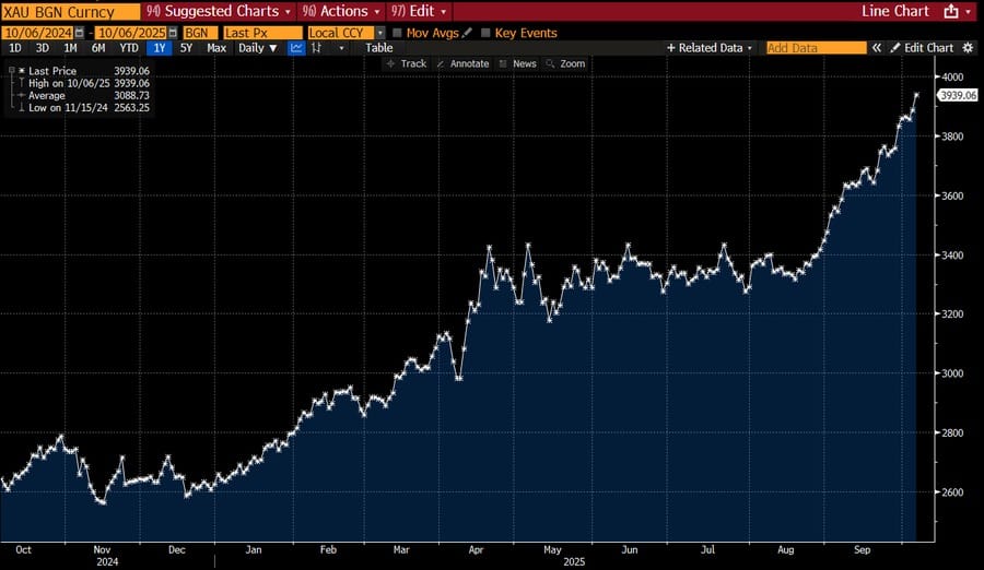 - Altın fiyatı son bir yılda 2.563 dolardan 3.939 dolara yükselerek parabolik bir harekete imza attı; grafik 4.000 dolar seviyesinin kapıda olduğunu gösteriyor.