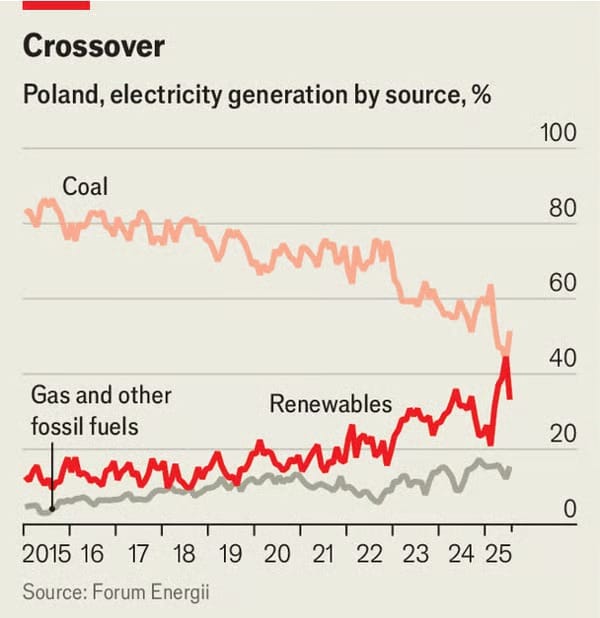 Enerji öne çıkıyor. Polonya’nın kömür madenlerinin ve ağır sanayisinin büyük kısmına ev sahipliği yapan güneyi uzun süredir ülkenin motoruydu. Bu artık değişiyor. Polonya, AB’nin temiz enerji hedefleriyle uyum sağlamak için kömürü 2049’a kadar aşamalı olarak devreden çıkarmayı planlıyor. Artan madencilik maliyetleri de ekonominin yeşile dönmesine yardımcı oluyor. Bu yıl Haziran ayında Polonya’da yenilenebilir enerji, tarihte ilk kez kömürden daha fazla elektrik üretti (grafiğe bakınız). Polonya, enerji ihtiyacını karşılamak için giderek Baltık kıyısına yöneliyor. Ülke, Świnoujście’deki tek LNG (sıvılaştırılmış doğal gaz) terminalinin kapasitesini yılda 8,3 milyar metreküpe çıkardı ve 2028’de Gdansk’ta yılda 6,1 milyar metreküp kapasiteli ikinci bir terminal açmayı planlıyor. 2022’de faaliyete geçen ve Norveç’ten Danimarka üzerinden geçen bir boru hattı da fazladan 10 milyar metreküp gaz sağlayabiliyor. Deniz aynı zamanda Polonya’nın nükleerleşmesine de yardımcı oluyor. Baltık’ın suları Akdeniz müdavimleri için fazla soğuk olabilir. Ama reaktör çekirdekleri için mükemmel, bu yüzden 2030’larda açılması planlanan Polonya’nın ilk nükleer santrali kıyıda yer alacak.