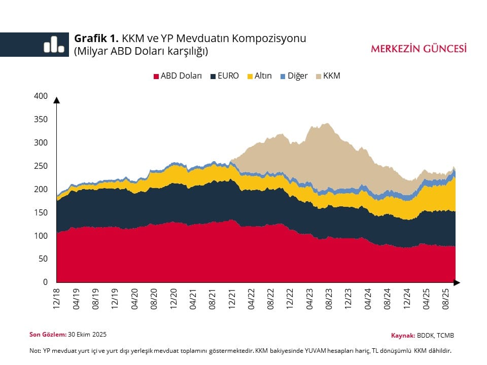 TCMB verilerine göre 2024 sonu itibarıyla 188 milyar dolar olan YP mevduatlar, 2025 Ekim itibarıyla 238 milyar dolara çıktı. Ancak bu artışın 31 milyar doları altın, 15 milyar doları euro, kalan kısmı ise dolar ve diğer döviz cinslerinden geldi.
