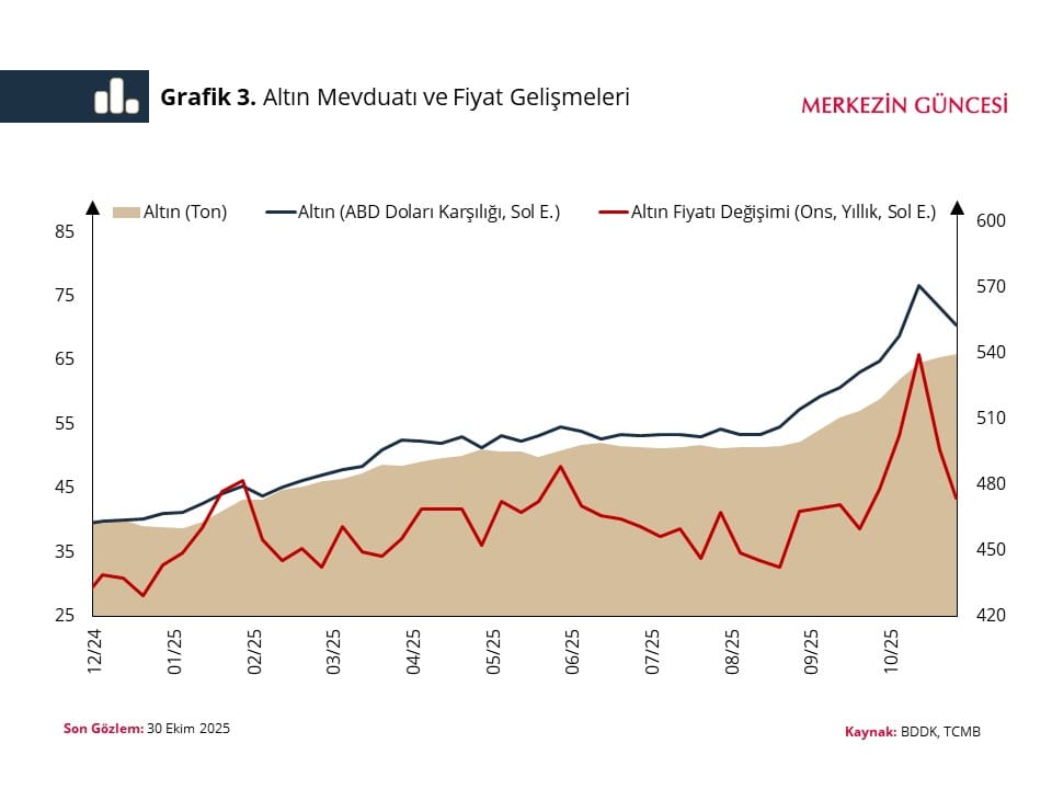 • Altın mevduatları, 2024 sonundan bu yana 76 ton artarak son iki ayda belirgin yükseldi; TL mevduat payı ise “tarihsel ortalamalarda” sabit kaldı.
