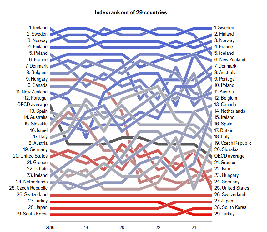 The Economist’in değerlendirmesine göre Cam Tavan Endeksi yıllar içinde küçük değişimler gösterse de ülkeler arasındaki sıralama büyük ölçüde sabit kalıyor. Kuzey Avrupa ülkeleri kadınların iş hayatına katılımı ve kariyer ilerlemesi açısından en güçlü performansı gösterirken Türkiye kadın istihdamı ve liderlik pozisyonlarındaki düşük temsil nedeniyle listenin en alt sıralarında yer alıyor.
