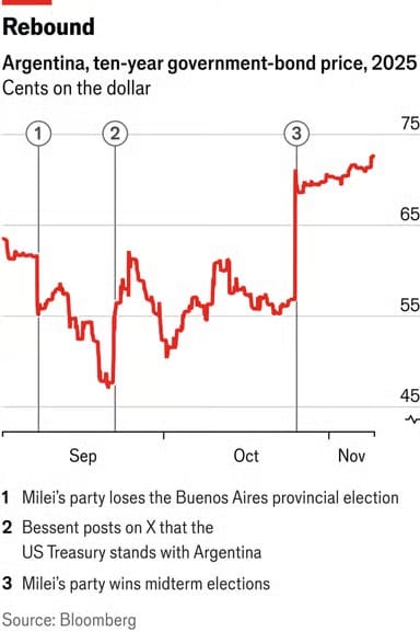26 Ekim’de yapılan ara seçimlerde ezici bir zafer kazanan Javier Milei, kabinesinde bazı değişiklikler yaptı ve 2026 bütçesinin yanı sıra vergi ve işgücü reformlarını hazırlarken güçlü eyalet valileriyle temasa geçti. Ülkenin temerrüt olasılığını ölçen “ülke risk endeksi” ocak ayından bu yana en düşük seviyesine geriledi.