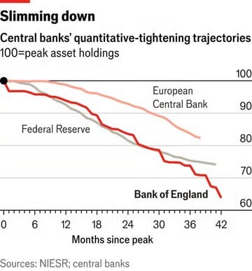 Asıl dikkatler ise bankanın niceliksel sıkılaştırma kararında olacak. Banka, her yıl 100 milyar sterlin (137 milyar dolar) değerinde devlet tahvili satışına giderek bilançosunu küçültüyor. Bu, büyük bir merkez bankası için olağanüstü yüksek bir oran. Bunun, G7 ülkeleri arasında uzun vadeli İngiliz tahvil getirilerini en yüksek seviyeye taşıyan etkenlerden biri olduğu düşünülüyor. Piyasa, bankanın satış hızını yılda 72 milyar sterline düşürmesini bekliyor. Daha ileri bir yavaşlama ise Britanya’nın borçlanma maliyetlerini artıran baskıyı hafifletebilir.
