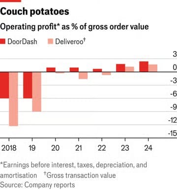 Amerika’nın en büyük yemek teslimat platformu DoorDash, perşembe günü 2,4 milyar sterlin (3,2 milyar $) karşılığında Deliveroo’yu devralacak. İrlanda, Fransa ve Birleşik Arap Emirlikleri dahil 12 ülkede faaliyet gösteren Britanyalı rakibiyle birleşme, DoorDash’in Amerika dışındaki işini üç kat büyütecek. İki şirket birlikte 2024’te dünya çapında 90 milyar dolarlık sipariş işledi; aylık 50 milyon kullanıcıya hizmet verdi.