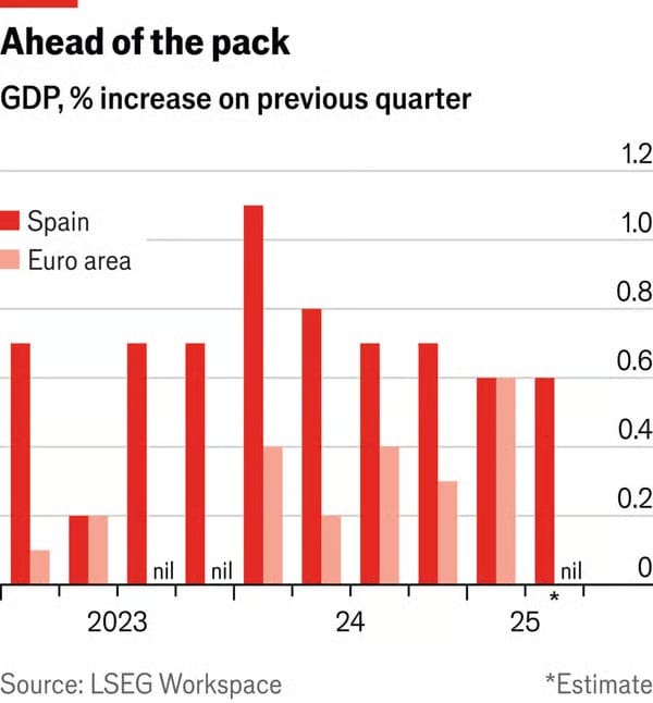 İspanya Başbakanı Pedro Sánchez, Sosyalist Partisi’nin yolsuzluk skandallarına karışması nedeniyle siyasi açıdan zor bir dönem geçiriyor. Ancak ülkenin ekonomik sağlığı bir nebze teselli sunabilir. Salı günü açıklanacak olan ikinci çeyrek öncü verilerinin, İspanya ekonomisinin önceki üç ayda kaydedilen %0,6 büyümeyi büyük ölçüde tekrar ettiğini göstermesi bekleniyor. Bu oran, muhtemelen Euro bölgesinin genel büyümesinden oldukça yüksek olacak.