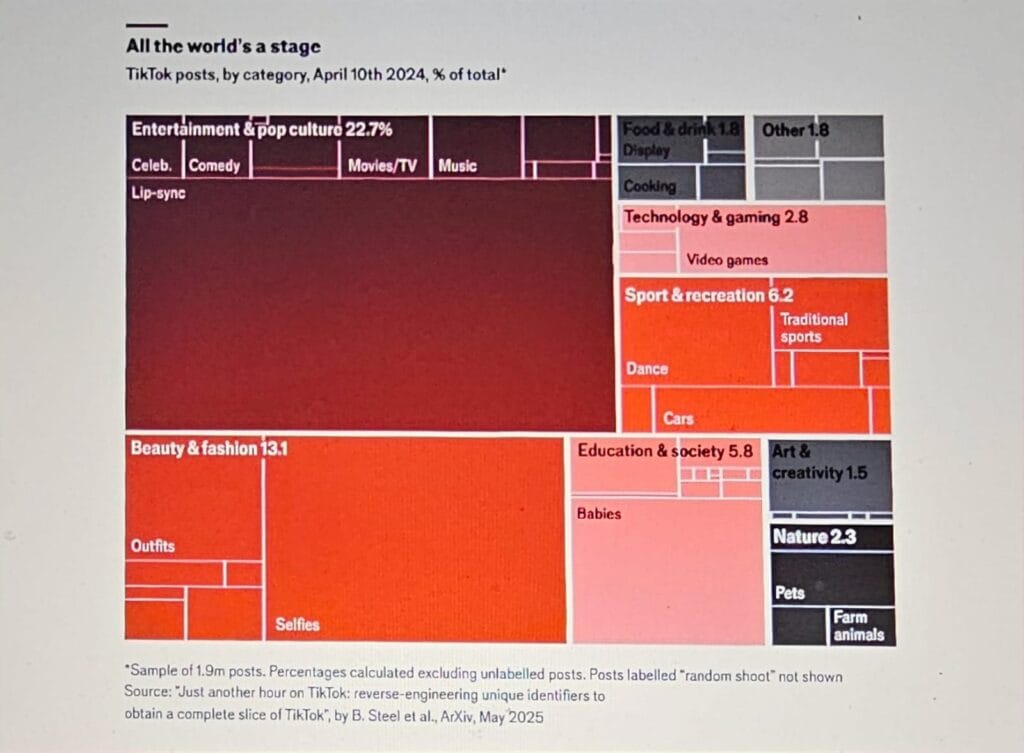 TikTok’ta kullanıcıların ne gördüğünü tam olarak değerlendirmek ise daha zor. Diğer sosyal medya şirketleri gibi platform da verilerini ketum bir şekilde saklıyor ve paylaşılan içeriklere dair merkezi bir genel bakış sunmuyor. Neyse ki bu yıl Mayıs ayında yayımlanan bir çalışma taslağında, araştırmacı Benjamin Steel ve birlikte çalıştığı yazarlar, kısa zaman aralıkları içinde platformda yayımlanan her videoyu yakalamanın akıllıca bir yolunu geliştirdi. Yazarlar, geçen yıl rastgele bir gün (10 Nisan 2024) yayımlanan gönderilerin bir örneklemini The Economist ile paylaştı. Bu da tam olarak ne kadar ve ne tür içerik paylaşıldığına dair bir fikir veriyor.