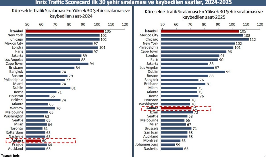 Küresel trafik verileri de tabloyu destekliyor. Inrix’in 2024–2025 karşılaştırmalı Traffic Scorecard raporunda Ankara, 28. sıradan 20. sıraya yükselerek trafik sıkışıklığının en sert yaşandığı şehirler listesinde 8 basamak kötüleşti. Aynı dönemde İstanbul zaten listenin zirvesindeydi; ancak Ankara’nın hızlı tırmanışı yapısal bir bozulmaya işaret ediyor.
