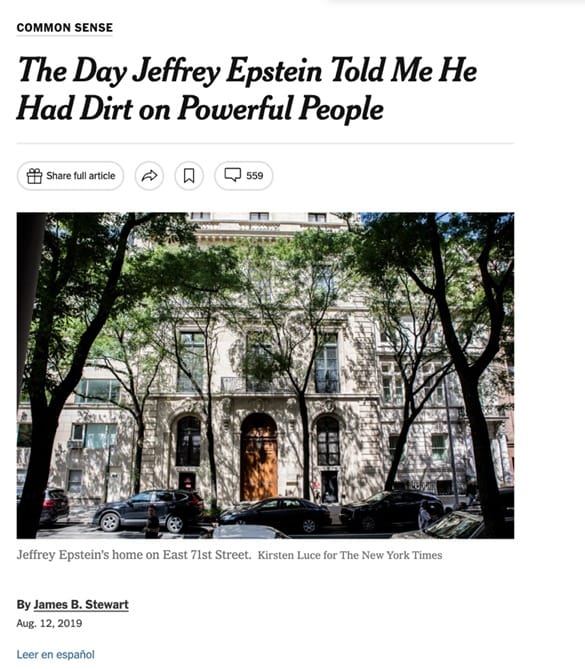 New York Times’ın deneyimli köşe yazarı James Stewart, çocuk tacizcisi ve fuhuş hükümlüsü Jeffrey Epstein’i ilk kez Manhattan’daki 9 katlı malikanesinde ziyaret etmişti. Takvimler 16 Ağustos 2018’i gösteriyordu. Epstein’in yine aynı suçlarla gözaltına alınıp tutuklu bir şekilde yargılanırken hapishanede intihar ettiği 2020 Ağustos’tan tam bir sene önce.