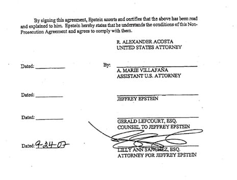 Epstein’ın avukatları bütün bu süreç işlerken Florida federal savcısı Alexander Acosta ile gizli görüşmeler yapıyor ve bir uzlaşı yolu arıyordu. Nihayetinde federal yetkililer ve Epstein’in ekibi bir uzlaşma metni üzerinde anlaştı. Federal yasaları ihlal ederek mağdurlara haber vermemiş, kendi aralarında bir itiraf anlaşmasını kaleme almışlardı. Federal savcılıkla yapılan anlaşmaya göre, Epstein küçük kız çocuklarını fuhşa teşvik ve fuhuş suçlarını işlediğini kabul etmişti. Karşılığında Epstein cinsel istismar suçlusu olarak resmi kayıtlara kaydolacak ve 18 ay hapis yatacaktı. İtiraf ettiği için hem cezası azalmış, hem de sadece eyalet yasalarını ihlalden ceza almıştı. Zira FBI, 53 sayfalık iddianamesinde hem eyaletler hem de ülkeler arası küçük kız çocuğu fuhşunu organize ettiğini ve teşvik ettiğini iddia etmişti. Epstein sadece Florida’yla kısıtlı bir suç varmışçasına şekillenen bir hüküm giymiş, böylece uluslararası ve eyaletler arası istismar ve fuhuş ağı su yüzüne çıkarılmamıştı. Bu anlaşmayla beraber üzerinde uzlaşılan suçlara ortak olanlar da isimleri dahi kamuoyuna açıklanmadan aklanmış oluyordu. Ve bir daha Epstein bu suçlardan yargılanamıyor, mağdurların haberi olmadan kolayca işin içinden sıyrılıyordu.