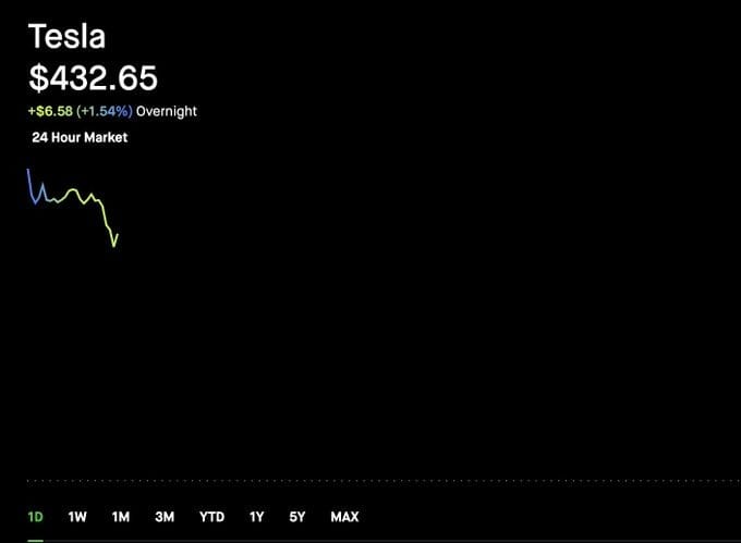 Tesla hisseleri, CEO Elon Musk ile Donald Trump’ın kamuya açık olarak görüldükleri bir ortamın ardından gecelik işlemlerde yaklaşık %2 oranında yükseldi. $TSLA şu an 432,65 $ civarında işlem görüyor. Görseldeki grafik de bu yükselişi destekler şekilde bir artış eğilimi gösteriyor.