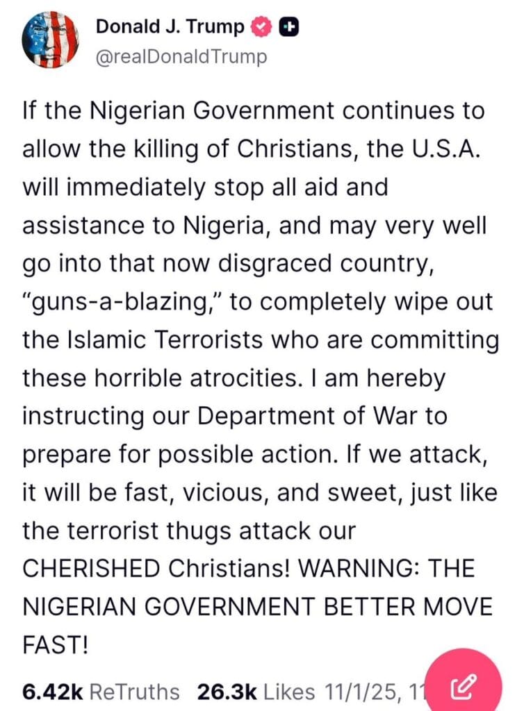 “Uyarı: Nijerya Hükümeti derhal harekete geçmeli! Trump bu gece de Nijerya’ya savaş ilan etti: ‘Nijerya, Hristiyanların öldürülmesine göz yummaya devam ederse, bu vahşetleri işleyen İslami teröristleri yok etmek için bu ülkeye girebiliriz.'”