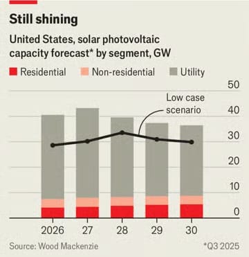 Yatırım patlamasının iki sebebi var. İlki, BBB’nin belirlediği son tarihlerden önce vergi kredilerine hak kazanmak için hızla projelere başlama yarışı. Güçlü oyuncular tedarik zincirinden gerekli bileşenleri sağlayarak öne çıkıyor, zayıf şirketlerin ise piyasadan çekilmesi bekleniyor. İkincisi, güneş enerjisine olan talep hâlâ çok güçlü. Wood Mackenzie’den Chris Seiple, Amerikan kamu hizmeti şirketlerinin 17 GW’lık yükleri şebekelerine bağlamakta olduğunu ve yapay zekâ ile veri merkezlerinin yükselişi sayesinde 99 GW daha taahhüt ettiklerini belirtiyor. Bu kapasitenin önemli kısmının güneşten geleceği öngörülüyor.