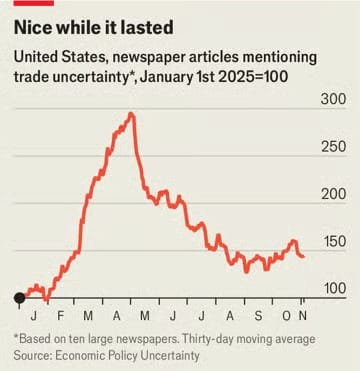 Yaz aylarında, Kanada ve Çin’le yaşanan gerilimlere rağmen, ticaret politikası nihayet biraz istikrar kazanmış görünüyordu (bkz. grafik). Fakat Yüksek Mahkeme’nin IEEPA kullanımına karşı bir karar vermesi, karmaşık, uzun ve kafa karıştırıcı bir yeniden yapılanmayı zorunlu kılacak — yani yeni bir belirsizlik dalgası anlamına gelecek.