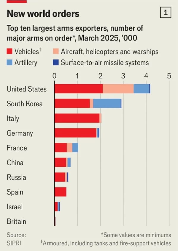 Birçoğu Güney Kore’ye yöneliyor. Amerika, Avrupa’daki NATO üyelerine en büyük silah ihracatçısı konumunda olsa da, Güney Kore ve Fransa ikinci sırayı paylaşıyor. Dünyada bazı silah kategorilerinde—örneğin tanklar ve topçularda—Güney Kore, Amerika’yı geride bırakıyor. Muharebe uçaklarında ise Amerika ve Fransa’nın ardından üçüncü sırada yer alıyor. Geçen yıl Güney Kore, Suudi Arabistan’a 3,2 milyar dolarlık Cheongung–II karadan havaya füze sistemi, Peru’ya 460 milyon dolar değerinde savaş gemisi ve Romanya’ya 1 milyar dolarlık kundağı motorlu obüs sattı.
