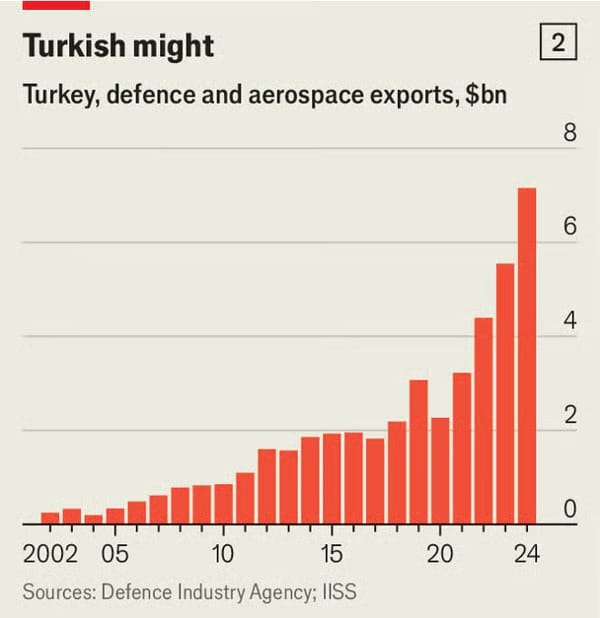 Bir diğer yükselen aktör ise Türkiye. Son beş yılda silah ihracatı hızla artarak yaklaşık 2 milyar dolardan geçen yıl 7 milyar doların üzerine çıktı (bkz. grafik 2). Bu artış, kısmen sivillerin yönettiği Savunma Sanayii Başkanlığı tarafından desteklenen stratejik özerklik çabalarının sonucu, diyor savunma uzmanı Arda Mevlütoğlu. Baykar’ın ürettiği dronlar, Çinli modelleri geride bırakıyor. TB2 sabit kanatlı modelden 500’den fazlası 30’dan fazla ülkeye satıldı. Suudi Arabistan, daha gelişmiş Akıncı adlı dronun ortak üretimi için 3 milyar dolarlık bir anlaşma imzaladı. Baykar, İtalyan Leonardo firmasıyla ortak girişime sahip; bu firma, gizlilik özellikli Kızılelma insansız savaş uçağını, planlanan altıncı nesil GCAP savaş uçaklarının yanında “sadık kanat arkadaşı” olarak kullanmayı hedefliyor.