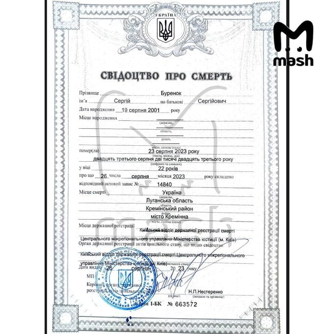 📄 Ölüm belgesi: 2001 doğumlu Serhiy Burenok’un resmi ölüm kaydı sızdırıldı. Belgeye göre, genç asker 23 Ağustos 2023’te Luhansk bölgesi Kreminna’da hayatını kaybetti. Bu tür belgeler, kayıp sayılarının somut dayanaklarla desteklenmeye çalışıldığını gösteriyor.