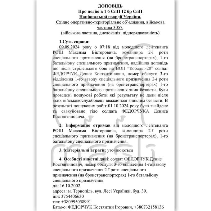📄 Askeri rapor: 2024 Eylül tarihli bir raporda, özel birlik askeri Denys Fedorchuk’un çatışmada kaybolduğu, aylar süren aramaların ardından cesedine ulaşıldığı yer alıyor. Bu da kayıp ve ölümler arasındaki gri alanı gözler önüne seriyor.