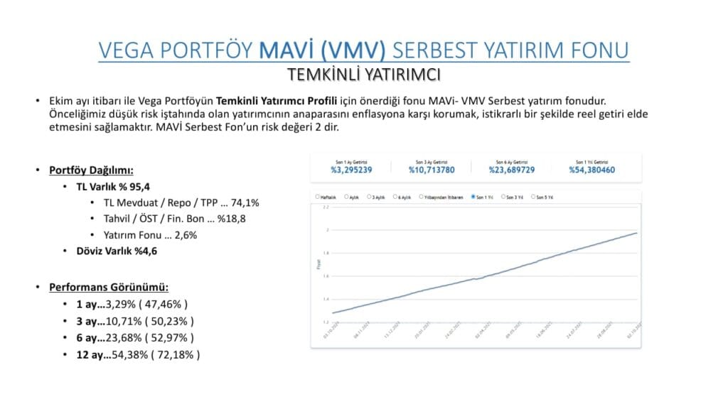Vega Portföy, farklı risk profillerine uygun iki fonunu yatırımcılara sunuyor. Mavi (VMV) Serbest Fon, temkinli yatırımcıya yönelik olarak tasarlanmış durumda. Portföyünün %95’i TL varlıklardan oluşuyor; bunun %74’ü mevduat/repo, %19’u tahvil, geri kalanı yatırım fonu ve küçük bir döviz payı. Son 12 aylık getirisi %54,38 olan fon, risk değeri 2 seviyesinde ve özellikle sermayesini korumak isteyen yatırımcı için öne çıkıyor.