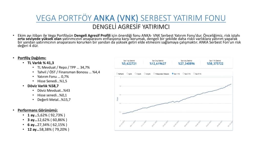 • Dengeli ve agresif yatırımcı profiline hitap eden Anka (VNK) Serbest Fon, son 1 yılda %58,37 getiri ile döviz ve değerli maden ağırlıklı portföyü sayesinde öne çıktı.