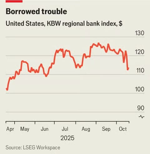 Yatırımcıların bir sonraki “böceğin” ortaya çıkmasını beklemesi uzun sürmedi. Amerikan bölgesel bankalarının hisseleri 16 Ekim’de %6 düştü. Bu sarsıntı, iki bölgesel bankanın—Arizona merkezli Western Alliance Bancorporation ve Utah merkezli Zions Bancorporation—toplam 160 milyon dolar borç verdikleri ve sahtekarlık temelli olduğunu öne sürdükleri bir yatırım fonu ağına karşı dava açtıklarını açıklamalarıyla tetiklendi. Borçlanan ağ olan Cantor Group ise herhangi bir yanlış yaptıklarını reddediyor.