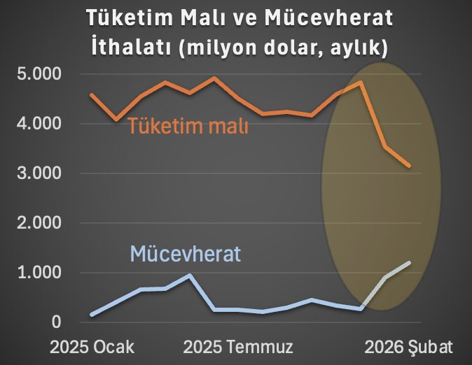 Grafiğe göre 2026 başında mücevherat ithalatı güçlü bir sıçrama yaparken, tüketim mallarında sert bir geri çekilme görülüyor.